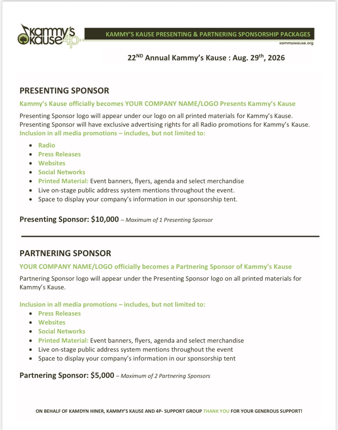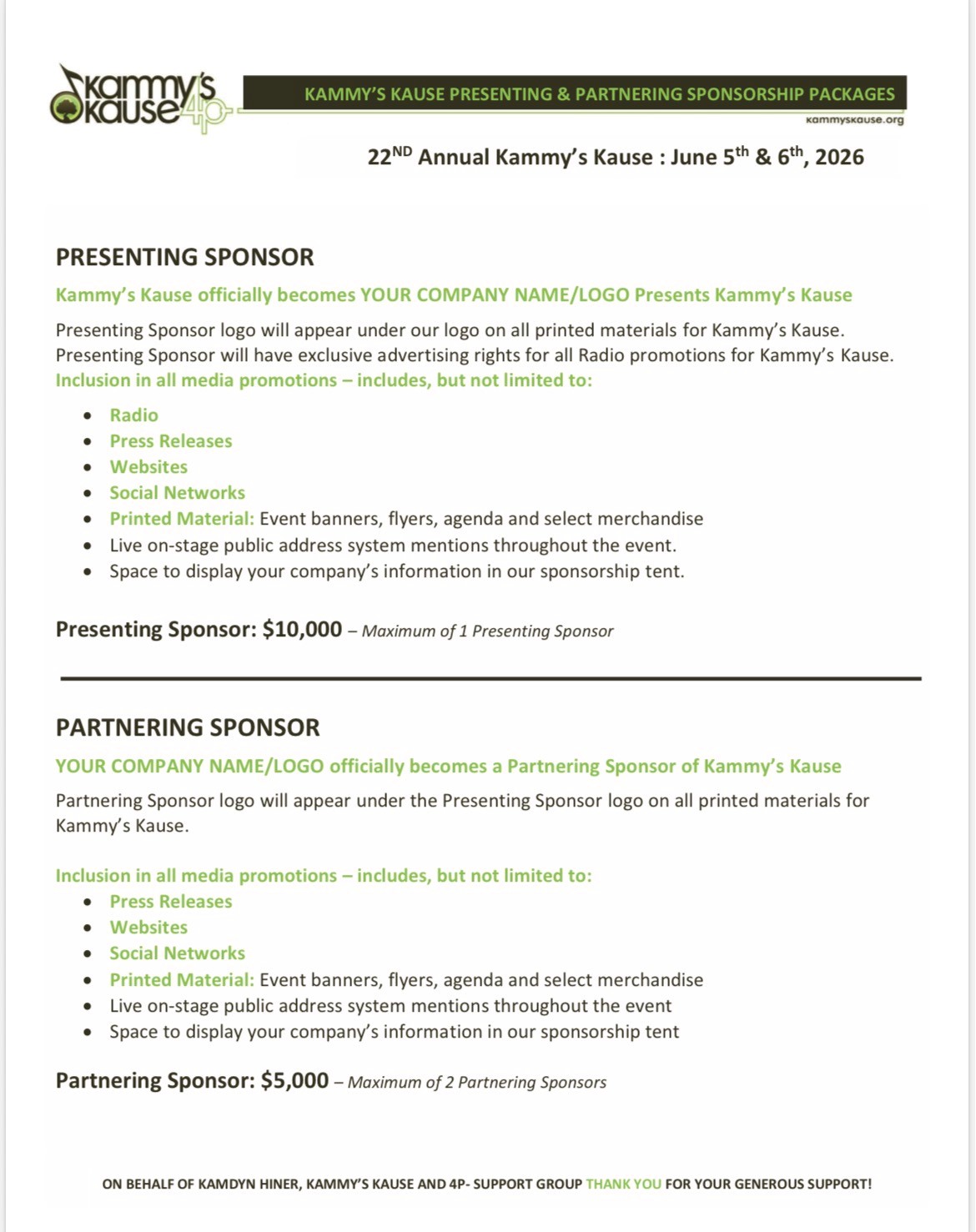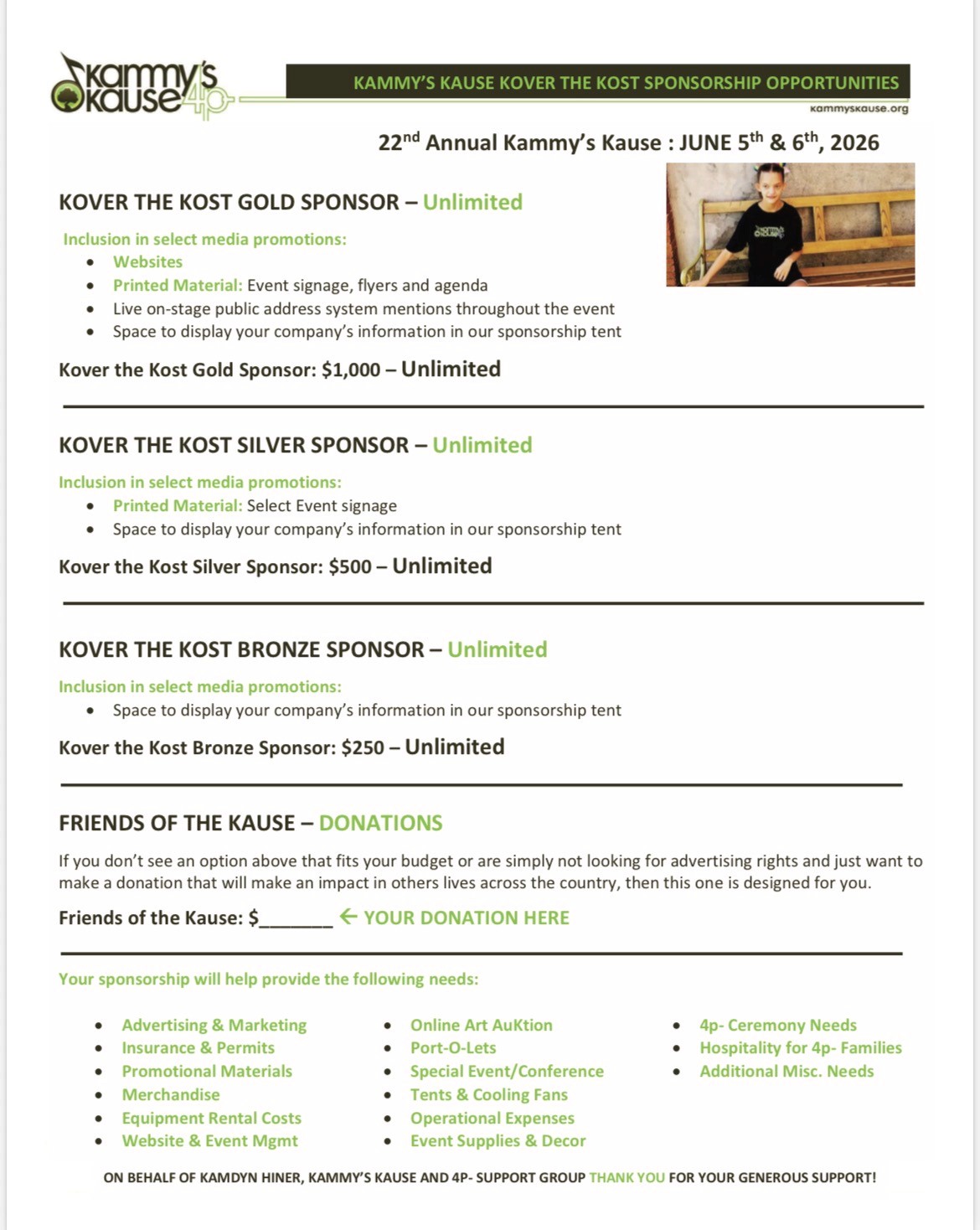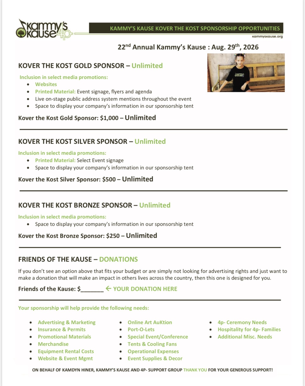 We are so glad you are interested in supporting Kammy’s Kause!